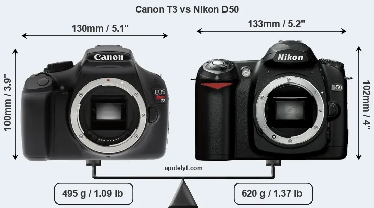 An illustration of the physical size and weight of the Canon T3 and the Nikon D50 is provided in the side-by-side display below. The two cameras are presented according to their relative size. Three consecutive views from the front, the top, and the rear side are shown. All width, height and depth dimensions are rounded to the nearest millimeter.