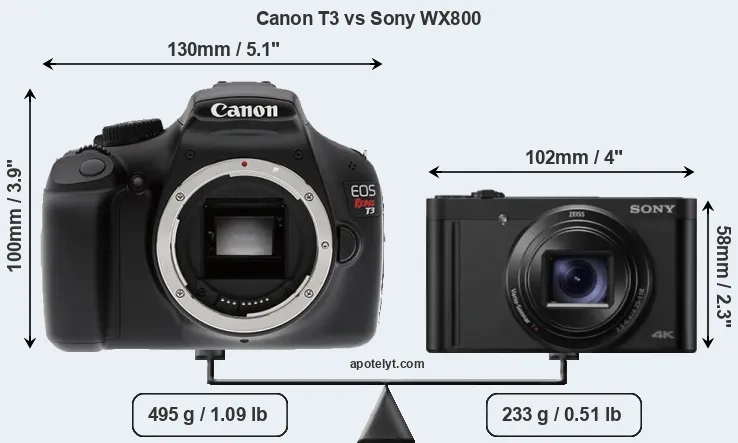 The physical size and weight of the Canon T3 and the Sony WX800 are illustrated in the side-by-side display below. The two cameras are presented according to their relative size. Three successive views from the front, the top, and the rear are shown. All size dimensions are rounded to the nearest millimeter.
