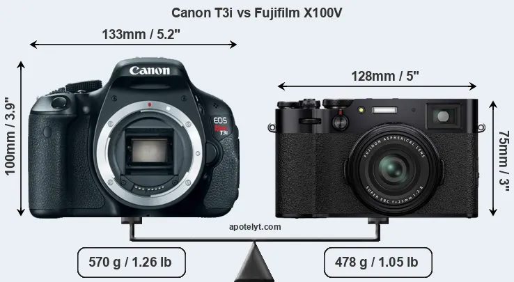 The side-by-side display below illustrates the physical size and weight of the Canon T3i and the Fujifilm X100V. The two cameras are presented according to their relative size. Three consecutive perspectives from the front, the top, and the back are available. All width, height and depth measures are rounded to the nearest millimeter.