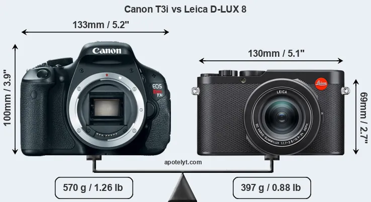 An illustration of the physical size and weight of the Canon T3i and the Leica D-LUX 8 is provided in the side-by-side display below. The two cameras are presented according to their relative size. Three consecutive views from the front, the top, and the rear side are shown. All width, height and depth dimensions are rounded to the nearest millimeter.