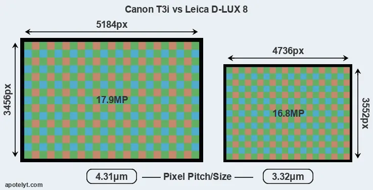 With 17.9MP, the T3i offers a slightly higher resolution than the D-LUX 8 (16.8MP), but the T3i nevertheless has larger individual pixels (pixel pitch of 4.31μm versus 3.32μm for the D-LUX 8) due to its larger sensor. However, the D-LUX 8 is a much more recent model (by 13 years and 4 months) than the T3i, and its sensor will have benefitted from technological advances during this time that further enhance the light gathering capacity of its pixels. Coming back to sensor resolution, it should be mentioned that the D-LUX 8 has no anti-alias filter installed, so that it can capture all the detail its sensor resolves.