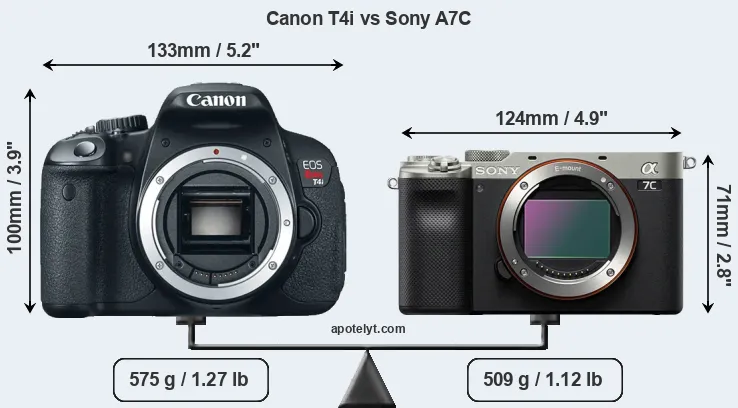 If the front view area (width x height) of the cameras is taken as an aggregate measure of their size, the Sony A7C is considerably smaller (34 percent) than the Canon T4i. Moreover, the A7C is markedly lighter (11 percent) than the T4i. It is noteworthy in this context that the A7C is splash and dust-proof, while the T4i does not feature any corresponding weather-sealing.