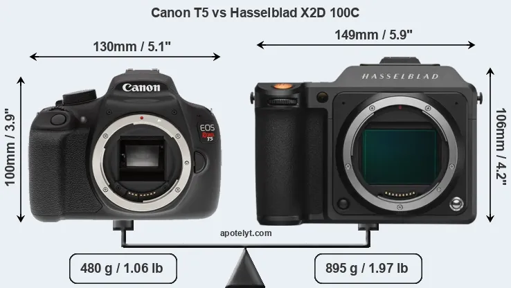 The Canon EOS Rebel T5 (called Canon 1200D in some regions) and the Hasselblad X2D 100C are two digital cameras that were revealed to the public, respectively, in February 2014 and September 2022. The T5 is a DSLR, while the X2D 100C is a mirrorless interchangeable lens camera. The cameras are based on an APS-C (T5) and a medium format (X2D 100C) sensor. The Canon has a resolution of 17.9 megapixels, whereas the Hasselblad provides 102.1 MP.