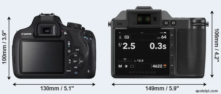 The side-by-side display below illustrates the physical size and weight of the Canon T5 and the Hasselblad X2D 100C. The two cameras are presented according to their relative size. Three consecutive views from the front, the top, and the rear side are shown. All width, height and depth measures are rounded to the nearest millimeter.