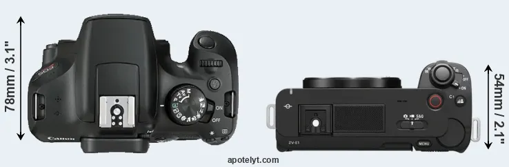 The side-by-side display below illustrates the physical size and weight of the Canon T6 and the Sony ZV-E1. The two cameras are presented according to their relative size. Three consecutive perspectives from the front, the top, and the back are available. All width, height and depth measures are rounded to the nearest millimeter.