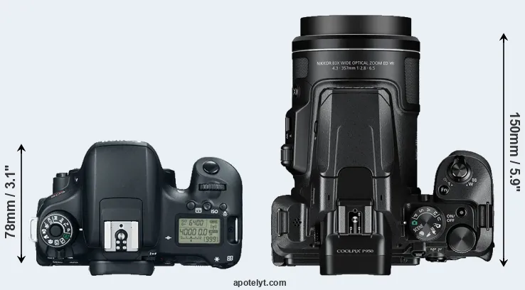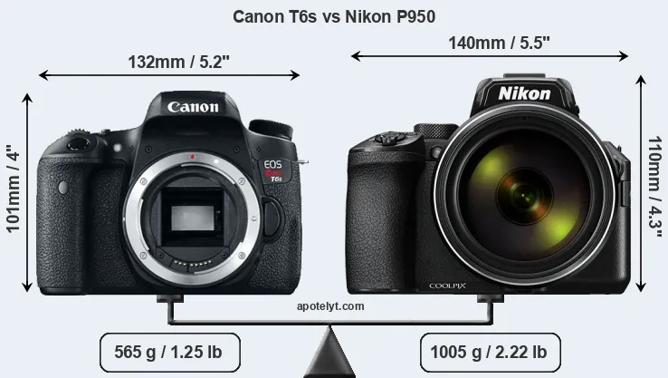 An illustration of the physical size and weight of the Canon T6s and the Nikon P950 is provided in the side-by-side display below. The two cameras are presented according to their relative size. Three consecutive views from the front, the top, and the rear side are shown. All width, height and depth dimensions are rounded to the nearest millimeter.