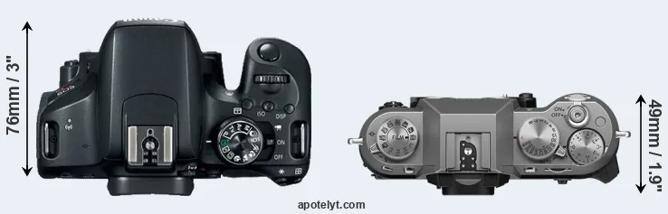 The physical size and weight of the Canon T7i and the Fujifilm X-T50 are illustrated in the side-by-side display below. The two cameras are presented according to their relative size. Three consecutive perspectives from the front, the top, and the back are available. All width, height and depth measures are rounded to the nearest millimeter.