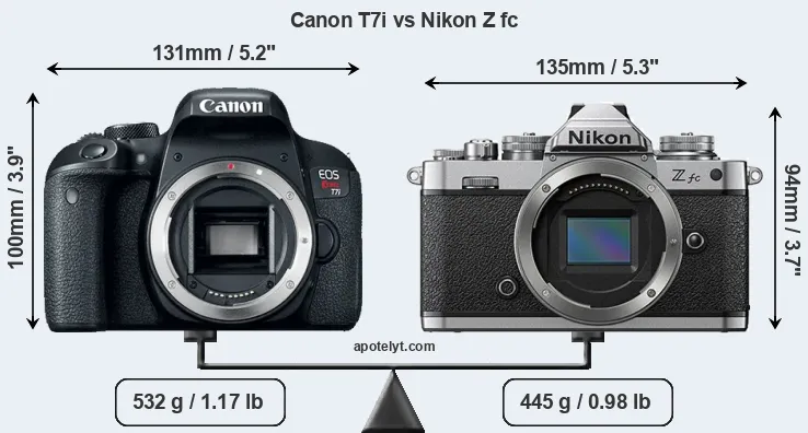 The side-by-side display below illustrates the physical size and weight of the Canon T7i and the Nikon Z fc. The two cameras are presented according to their relative size. Three successive views from the front, the top, and the rear are shown. All width, height and depth dimensions are rounded to the nearest millimeter.