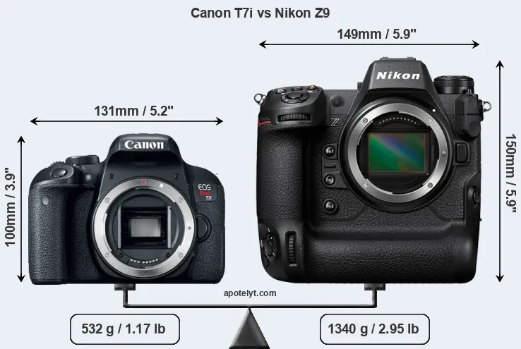 If the front view area (width x height) of the cameras is taken as an aggregate measure of their size, the Nikon Z9 is considerably larger (71 percent) than the Canon T7i. Moreover, the Z9 is substantially heavier (152 percent) than the T7i. It is noteworthy in this context that the Z9 is splash and dust-proof, while the T7i does not feature any corresponding weather-sealing.