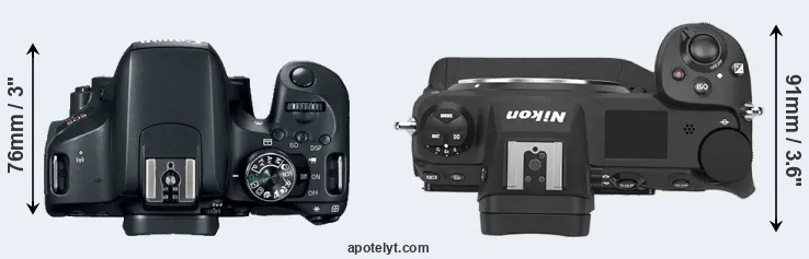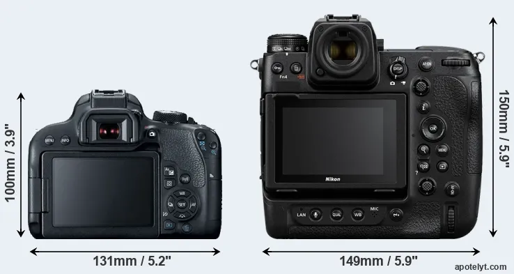 The side-by-side display below illustrates the physical size and weight of the Canon T7i and the Nikon Z9. The two cameras are presented according to their relative size. Three successive views from the front, the top, and the rear are shown. All size dimensions are rounded to the nearest millimeter.