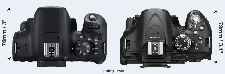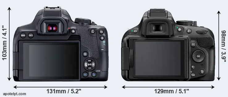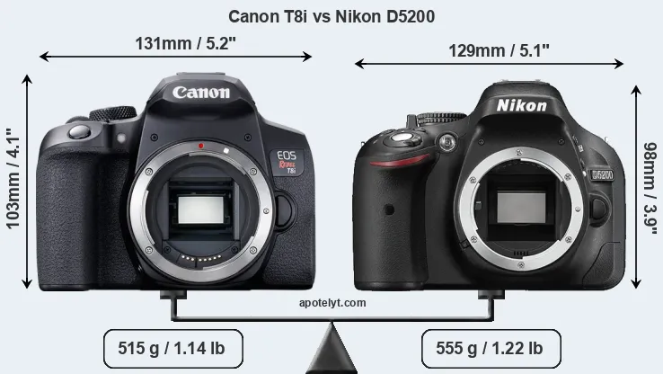 The physical size and weight of the Canon T8i and the Nikon D5200 are illustrated in the side-by-side display below. The two cameras are presented according to their relative size. Three consecutive perspectives from the front, the top, and the back are available. All width, height and depth dimensions are rounded to the nearest millimeter.