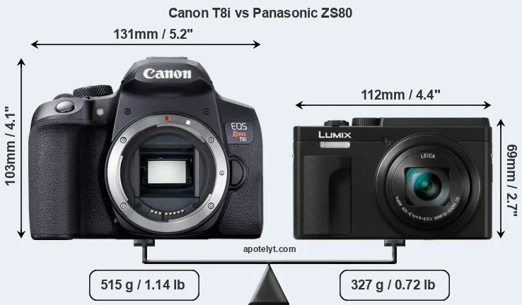 The physical size and weight of the Canon T8i and the Panasonic ZS80 are illustrated in the side-by-side display below. The two cameras are presented according to their relative size. Three successive views from the front, the top, and the rear are shown. All width, height and depth dimensions are rounded to the nearest millimeter.