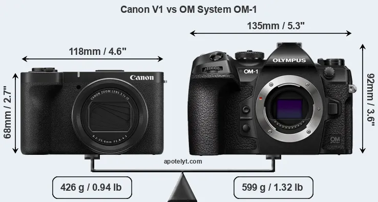 An illustration of the physical size and weight of the Canon V1 and the OM System OM-1 is provided in the side-by-side display below. The two cameras are presented according to their relative size. Three successive views from the front, the top, and the rear are shown. All width, height and depth dimensions are rounded to the nearest millimeter.