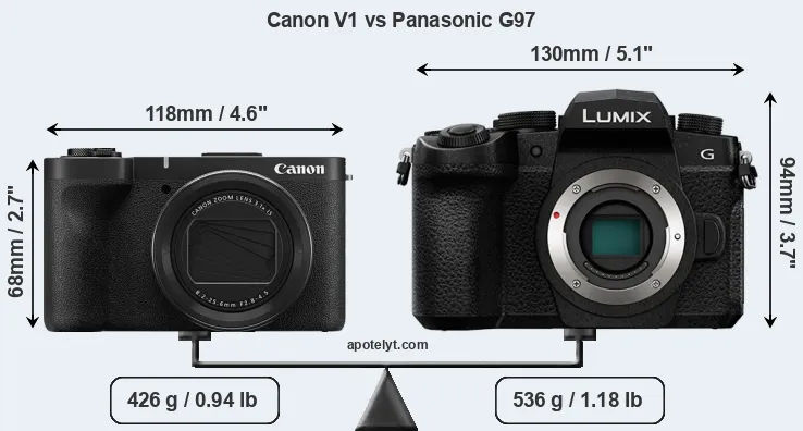 If the front view area (width x height) of the cameras is taken as an aggregate measure of their size, the Panasonic G97 is considerably larger (52 percent) than the Canon V1. It is noteworthy in this context that the G97 is splash and dust-proof, while the V1 does not feature any corresponding weather-sealing.