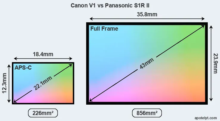 Of the two cameras under consideration, the Canon V1 features an APS-C sensor and the Panasonic S1R II a full frame sensor. The sensor area in the S1R II is 279 percent bigger. As a result of these sensor size differences, the cameras have a format factor of, respectively, 1.6 and 1.0. Both cameras have a native aspect ratio (sensor width to sensor height) of 3:2.