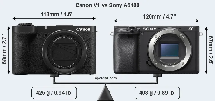 An illustration of the physical size and weight of the Canon V1 and the Sony A6400 is provided in the side-by-side display below. The two cameras are presented according to their relative size. Three consecutive perspectives from the front, the top, and the back are available. All width, height and depth dimensions are rounded to the nearest millimeter.