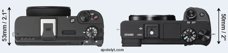 If the front view area (width x height) of the cameras is taken as an aggregate measure of their size, the Canon V1 and the Sony A6400 are of equal size. It is noteworthy in this context that the A6400 is splash and dust-proof, while the V1 does not feature any corresponding weather-sealing.