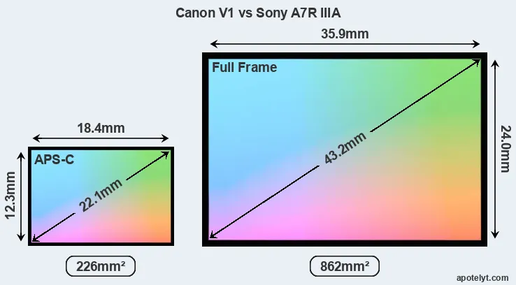 Of the two cameras under consideration, the Canon V1 features an APS-C sensor and the Sony A7R IIIA a full frame sensor. The sensor area in the A7R IIIA is 281 percent bigger. As a result of these sensor size differences, the cameras have a format factor of, respectively, 1.6 and 1.0. Both cameras have a native aspect ratio (sensor width to sensor height) of 3:2.