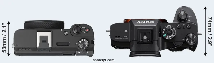 The physical size and weight of the Canon V1 and the Sony A7R IIIA are illustrated in the side-by-side display below. The two cameras are presented according to their relative size. Three consecutive views from the front, the top, and the rear side are shown. All width, height and depth measures are rounded to the nearest millimeter.