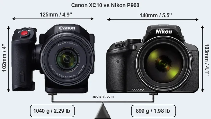 An illustration of the physical size and weight of the Canon XC10 and the Nikon P900 is provided in the side-by-side display below. The two cameras are presented according to their relative size. Three consecutive views from the front, the top, and the rear side are shown. All width, height and depth measures are rounded to the nearest millimeter.