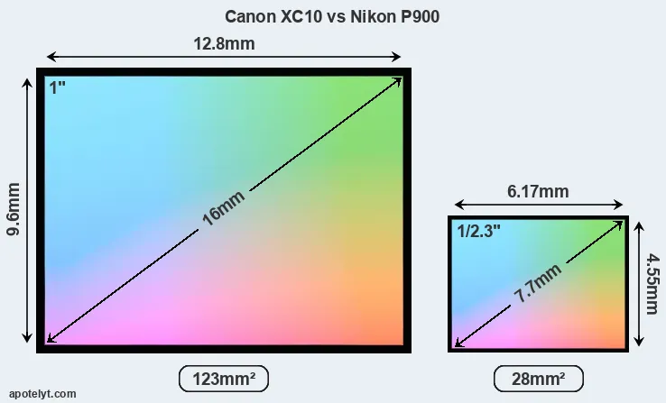 Of the two cameras under consideration, the Canon XC10 features an one-inch sensor and the Nikon P900 a 1/2.3-inch sensor. The sensor area in the P900 is 77 percent smaller. As a result of these sensor size differences, the cameras have a format factor of, respectively, 2.75 and 5.6. Both cameras feature a native aspect ratio (sensor width to sensor height) of 4:3.