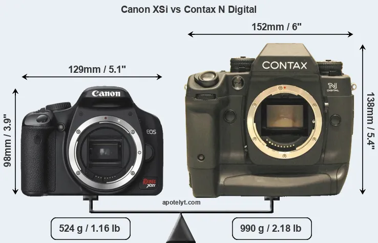 If the front view area (width x height) of the cameras is taken as an aggregate measure of their size, the Contax N Digital is considerably larger (66 percent) than the Canon XSi. Moreover, the N Digital is substantially heavier (89 percent) than the XSi. In this context, it is worth noting that neither the XSi nor the N Digital are weather-sealed.