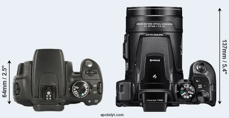 An illustration of the physical size and weight of the Canon XT and the Nikon P900 is provided in the side-by-side display below. The two cameras are presented according to their relative size. Three successive views from the front, the top, and the rear are shown. All width, height and depth measures are rounded to the nearest millimeter.