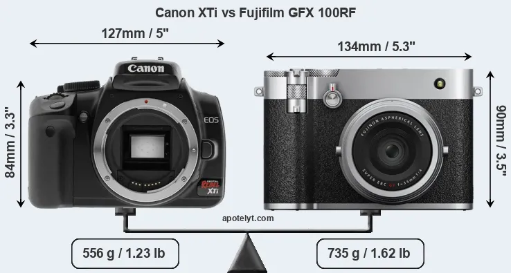 The physical size and weight of the Canon XTi and the Fujifilm GFX 100RF are illustrated in the side-by-side display below. The two cameras are presented according to their relative size. Three successive views from the front, the top, and the rear are shown. All width, height and depth measures are rounded to the nearest millimeter.