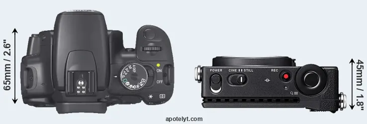 The physical size and weight of the Canon XTi and the Sigma fp are illustrated in the side-by-side display below. The two cameras are presented according to their relative size. Three consecutive perspectives from the front, the top, and the back are available. All size dimensions are rounded to the nearest millimeter.