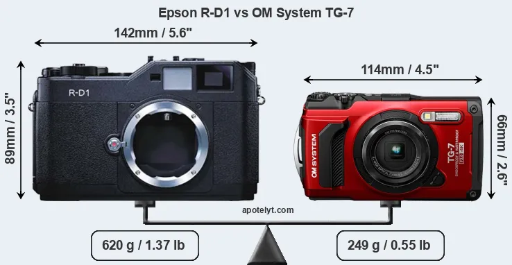 Going beyond this snapshot of core features and characteristics, what are the differences between the Epson R-D1 and the OM System Tough TG-7? Which one should you buy? Read on to find out how these two cameras compare with respect to their body size, their imaging sensors, their shooting features, their input-output connections, and their reception by expert reviewers.