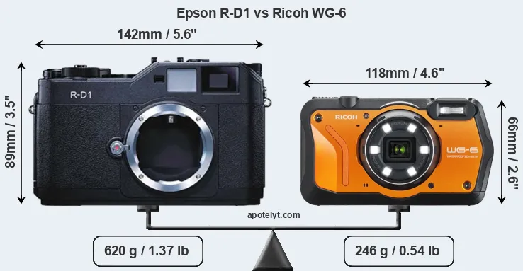 The side-by-side display below illustrates the physical size and weight of the Epson R-D1 and the Ricoh WG-6. The two cameras are presented according to their relative size. Three consecutive views from the front, the top, and the rear side are shown. All width, height and depth dimensions are rounded to the nearest millimeter.