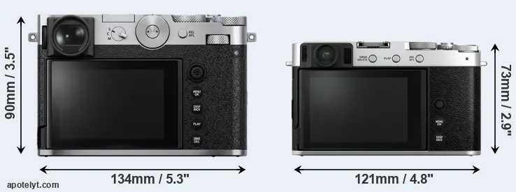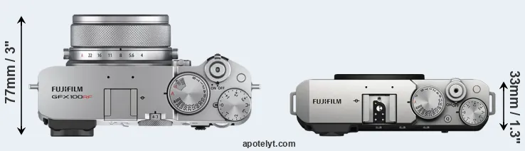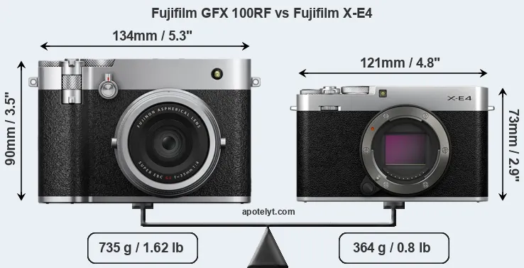 The side-by-side display below illustrates the physical size and weight of the Fujifilm GFX 100RF and the Fujifilm X-E4. The two cameras are presented according to their relative size. Three consecutive perspectives from the front, the top, and the back are available. All width, height and depth dimensions are rounded to the nearest millimeter.