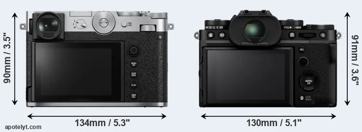 If the front view area (width x height) of the cameras is taken as an aggregate measure of their size, the Fujifilm X-T5 is somewhat smaller (2 percent) than the Fujifilm GFX 100RF. In this context, it is worth noting that both cameras are splash and dust-proof and can, hence, be used in inclement weather conditions or harsh environments.