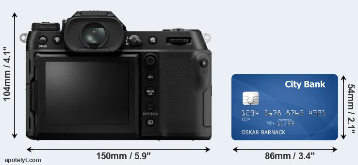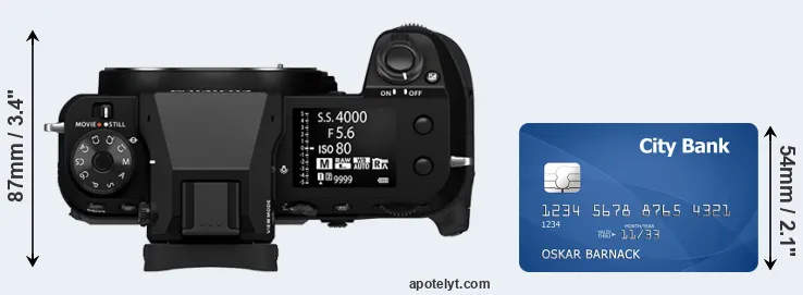 The side-by-side display below illustrates the physical size of the Fujifilm GFX 100S II vis-à-vis a credit card. Three consecutive views from the front, the top, and the rear side are shown. All width, height and depth dimensions are rounded to the nearest millimeter.