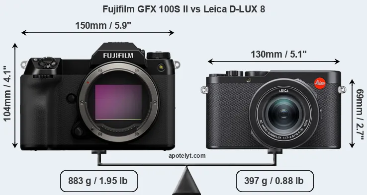The physical size and weight of the Fujifilm GFX 100S II and the Leica D-LUX 8 are illustrated in the side-by-side display below. The two cameras are presented according to their relative size. Three consecutive perspectives from the front, the top, and the back are available. All width, height and depth measures are rounded to the nearest millimeter.
