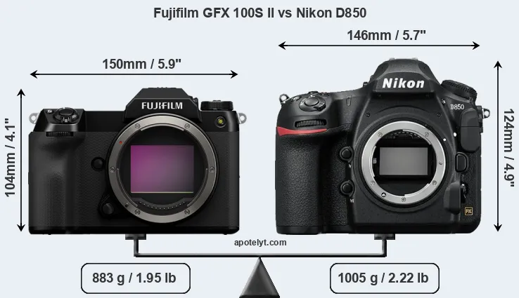 The side-by-side display below illustrates the physical size and weight of the Fujifilm GFX 100S II and the Nikon D850. The two cameras are presented according to their relative size. Three consecutive views from the front, the top, and the rear side are shown. All width, height and depth measures are rounded to the nearest millimeter.