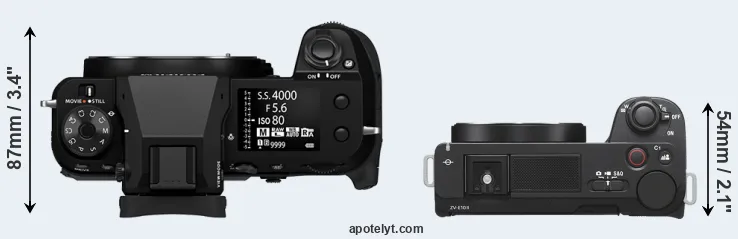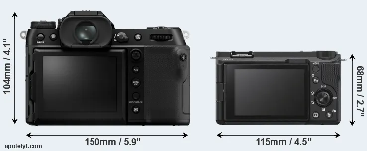 The physical size and weight of the Fujifilm GFX 100S II and the Sony ZV-E10 II are illustrated in the side-by-side display below. The two cameras are presented according to their relative size. Three consecutive perspectives from the front, the top, and the back are available. All width, height and depth dimensions are rounded to the nearest millimeter.