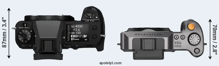 The side-by-side display below illustrates the physical size and weight of the Fujifilm GFX 50S II and the Hasselblad X1D II. The two cameras are presented according to their relative size. Three successive views from the front, the top, and the rear are shown. All size dimensions are rounded to the nearest millimeter.
