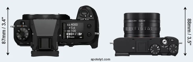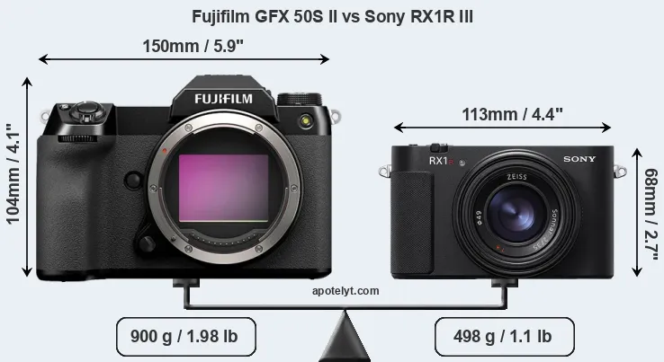 The side-by-side display below illustrates the physical size and weight of the Fujifilm GFX 50S II and the Sony RX1R III. The two cameras are presented according to their relative size. Three consecutive views from the front, the top, and the rear side are shown. All width, height and depth measures are rounded to the nearest millimeter.