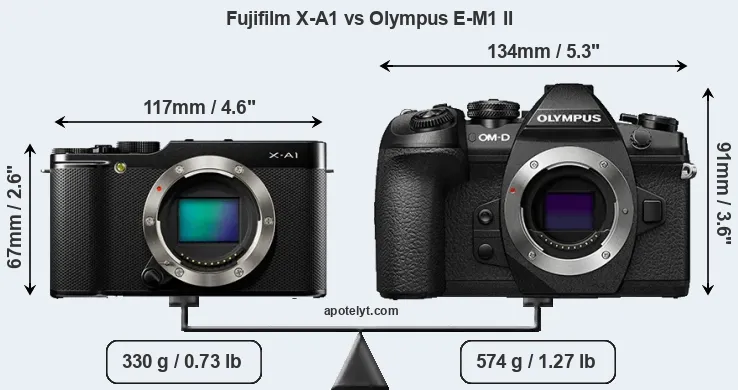 If the front view area (width x height) of the cameras is taken as an aggregate measure of their size, the Olympus E-M1 II is considerably larger (56 percent) than the Fujifilm X-A1. Moreover, the E-M1 II is substantially heavier (74 percent) than the X-A1. It is noteworthy in this context that the E-M1 II is splash and dust-proof, while the X-A1 does not feature any corresponding weather-sealing.