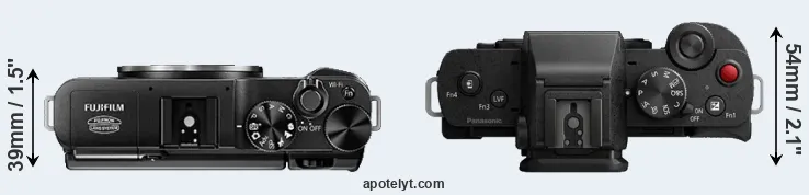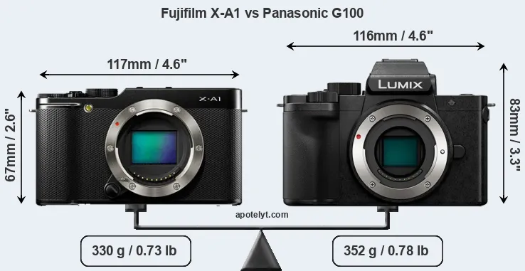 The physical size and weight of the Fujifilm X-A1 and the Panasonic G100 are illustrated in the side-by-side display below. The two cameras are presented according to their relative size. Three consecutive perspectives from the front, the top, and the back are available. All width, height and depth dimensions are rounded to the nearest millimeter.