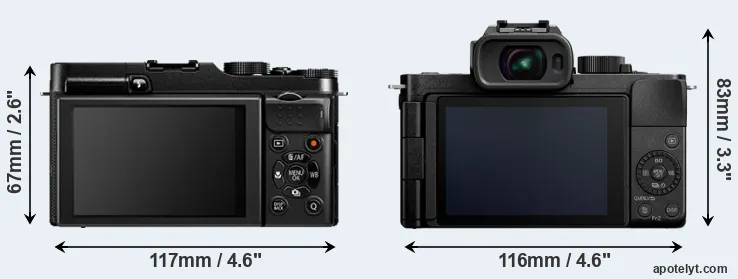 If the front view area (width x height) of the cameras is taken as an aggregate measure of their size, the Panasonic G100 is notably larger (23 percent) than the Fujifilm X-A1. Moreover, the G100 is markedly heavier (7 percent) than the X-A1. In this context, it is worth noting that neither the X-A1 nor the G100 are weather-sealed.