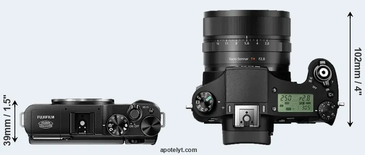 The side-by-side display below illustrates the physical size and weight of the Fujifilm X-A1 and the Sony RX10 II. The two cameras are presented according to their relative size. Three successive views from the front, the top, and the rear are shown. All width, height and depth dimensions are rounded to the nearest millimeter.