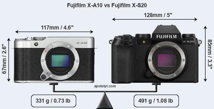 If the front view area (width x height) of the cameras is taken as an aggregate measure of their size, the Fujifilm X-S20 is notably larger (39 percent) than the Fujifilm X-A10. Moreover, the X-S20 is substantially heavier (48 percent) than the X-A10. In this context, it is worth noting that neither the X-A10 nor the X-S20 are weather-sealed.