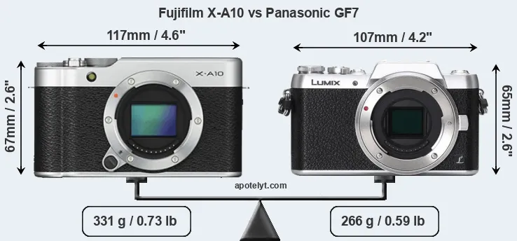 An illustration of the physical size and weight of the Fujifilm X-A10 and the Panasonic GF7 is provided in the side-by-side display below. The two cameras are presented according to their relative size. Three successive views from the front, the top, and the rear are shown. All width, height and depth dimensions are rounded to the nearest millimeter.