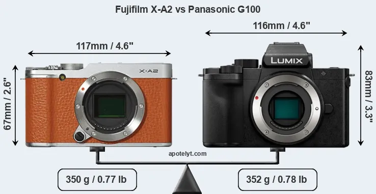 An illustration of the physical size and weight of the Fujifilm X-A2 and the Panasonic G100 is provided in the side-by-side display below. The two cameras are presented according to their relative size. Three successive views from the front, the top, and the rear are shown. All width, height and depth dimensions are rounded to the nearest millimeter.