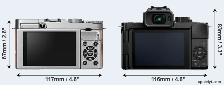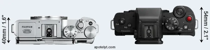 If the front view area (width x height) of the cameras is taken as an aggregate measure of their size, the Panasonic G100 is notably larger (23 percent) than the Fujifilm X-A2. Moreover, the G100 is slightly heavier (1 percent) than the X-A2. In this context, it is worth noting that neither the X-A2 nor the G100 are weather-sealed.