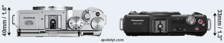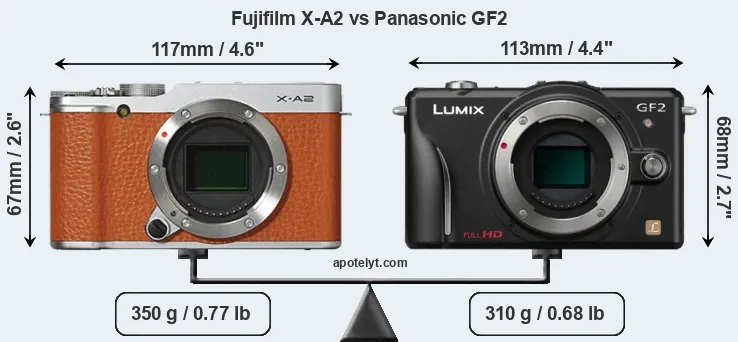 An illustration of the physical size and weight of the Fujifilm X-A2 and the Panasonic GF2 is provided in the side-by-side display below. The two cameras are presented according to their relative size. Three consecutive perspectives from the front, the top, and the back are available. All size dimensions are rounded to the nearest millimeter.