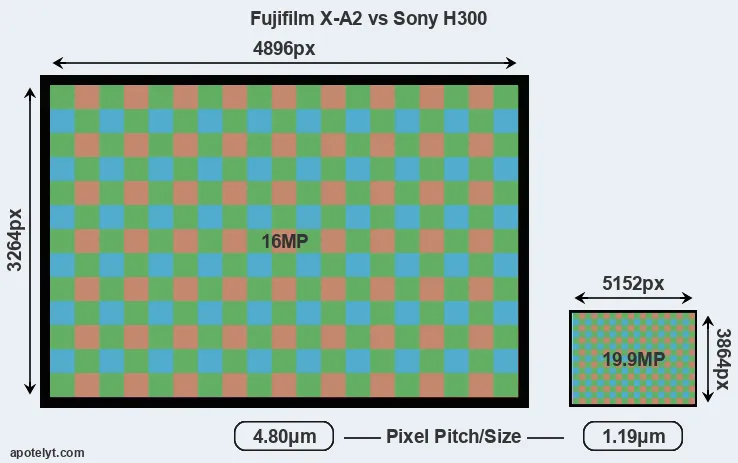 Despite having a smaller sensor, the H300 offers a higher resolution of 19.9 megapixels, compared with 16 MP of the X-A2. This megapixels advantage comes at the cost of a higher pixel density and a smaller size of the individual pixel (with a pixel pitch of 1.19μm versus 4.80μm for the X-A2). Moreover, it should be noted that the X-A2 is a somewhat more recent model (by 11 months) than the H300, and its sensor might have benefitted from technological advances during this time that further enhance the light gathering capacity of its pixels. Coming back to sensor resolution, it should be mentioned that the H300 has no anti-alias filter installed, so that it can capture all the detail its sensor resolves.