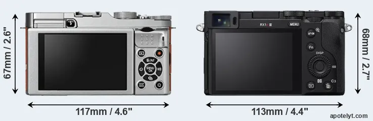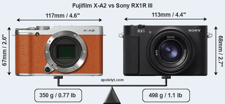 The side-by-side display below illustrates the physical size and weight of the Fujifilm X-A2 and the Sony RX1R III. The two cameras are presented according to their relative size. Three consecutive perspectives from the front, the top, and the back are available. All width, height and depth measures are rounded to the nearest millimeter.
